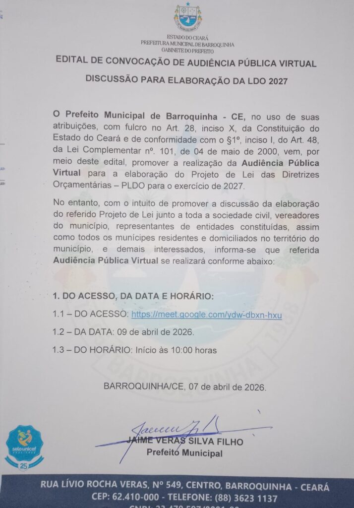A Prefeitura de Barroquinha convida toda a população para participar da discussão da elaboração da LDO 2027 (Lei de Diretrizes Orçamentårias).
