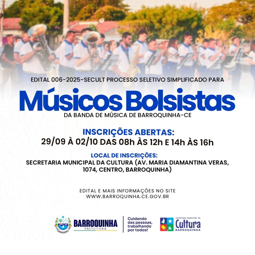 O Município de Barroquinha, Ceará, através da Secretaria Municipal da Cultura, neste ato representado pelo Secretário de Cultura o sr. Thales Ferreira Rocha Soares, torna público que estão abertas as inscrições objetivando selecionar músicos/bolsistas para compor a BANDA DE MÚSICA DE BARROQUINHA-CE, nos termos da Lei Municipal n° 669/2023 de 21 de junho de 2023, e observada as disposições legais, e, em particular, as normas contidas neste Edital.
