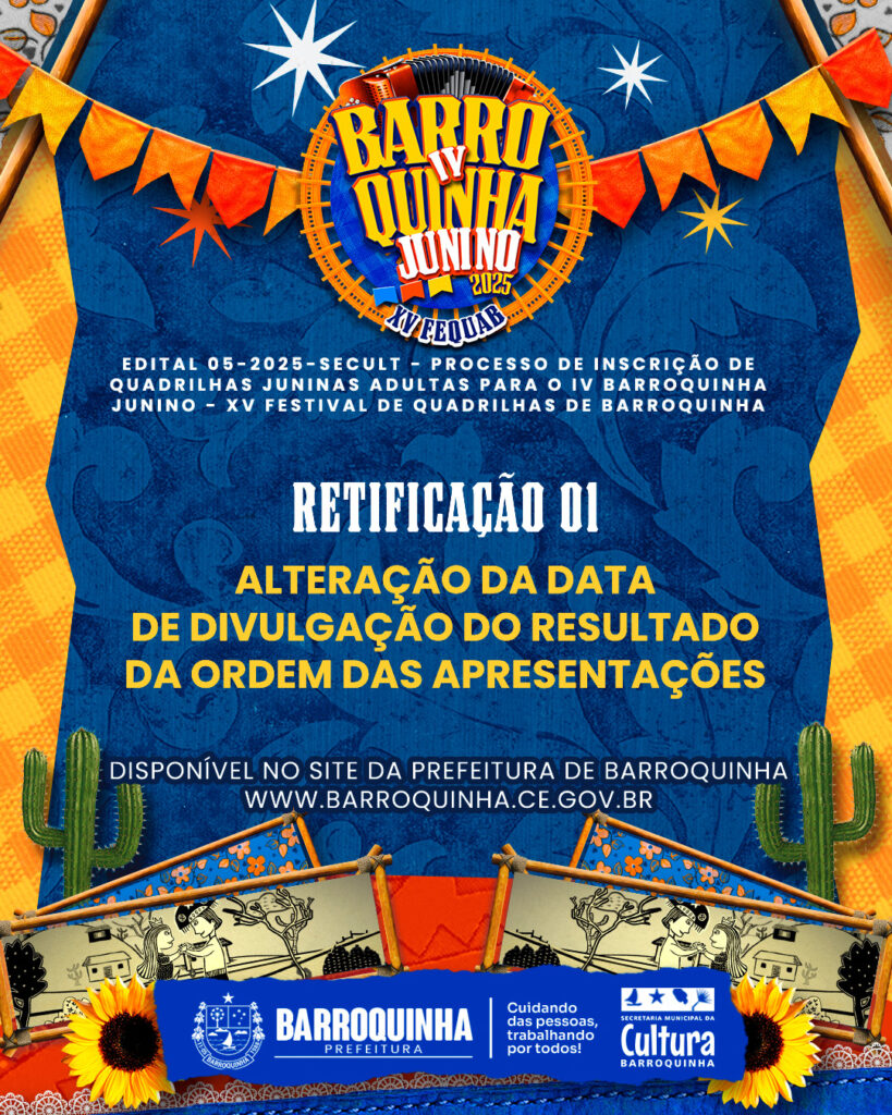 A Secretaria Municipal da Cultura, no uso de suas atribuições legais, torna público a retificação ao EDITAL 05-2025-SECULT – PROCESSO DE INSCRIÇÃO DE QUADRILHAS JUNINAS ADULTAS PARA O IV BARROQUINHA JUNINO – XV FESTIVAL DE QUADRILHAS DE BARROQUINHA, onde altera a data de divulgação do resultado da ordem de apresentação, conforme se demonstra a seguir.