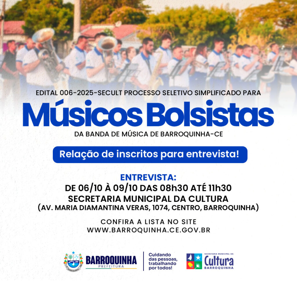 A SECRETARIA MUNICIPAL DA CULTURA DE BARROQUINHA DIVULGA A RELAÇÃO DE PESSOAS INSCRITAS E QUE ESTÃO APTAS PARA PARTICIPAR DA ENTREVISTA NO EDITAL Nº 006-2025-SECULT – PROCESSO SELETIVO SIMPLIFICADO PARA MÚSICOS BOLSISTAS DA BANDA DE MÚSICA DE BARROQUINHA-CE, CONFORME ANEXO.