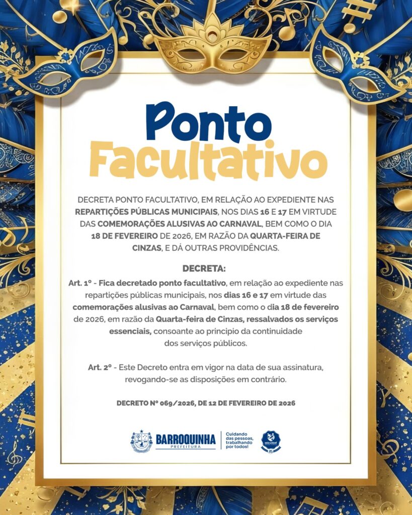 A Prefeitura Municipal de Barroquinha publicou o Decreto Municipal nº 069/2026, de 12 de fevereiro de 2026, que estabelece ponto facultativo nas repartições públicas municipais nos dias 16 e 17 de fevereiro, em virtude das comemorações de Carnaval, bem como no dia 18 de fevereiro de 2026, em razão da Quarta-feira de Cinzas.