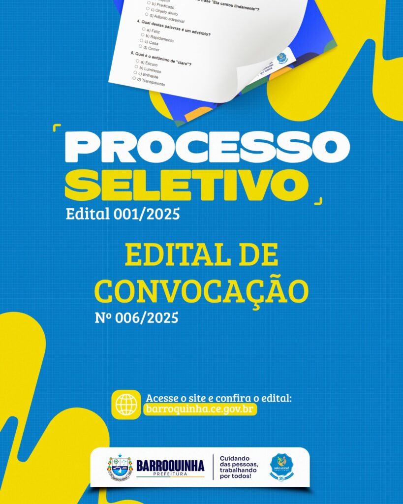 A SECRETARIA MUNICIPAL DO TRABALHO, DESENVOLVIMENTO SOCIAL E DIREITOS HUMANOS, no uso de suas atribuições previstas na Lei Municipal nº 710/2025, de 17 de fevereiro de 2025, alterado pela Lei Municipal n° 717/2025, de 18 de março de 2025, que lhe confere o artigo 65, inciso XI da Lei Orgânica do Município, e no PROCESSO SELETIVO SIMPLIFICADO para prover os cargos existentes no Quadro Pessoal da Prefeitura Municipal de Barroquinha/CE, resolve CONVOCAR o (a) candidato (a) que se encontra na posição de CLASSIFICÁVEL conforme ANEXO I a COMPARECER NA SEDE DA SECRETARIA MUNICIPAL DO TRABALHO, DESENVOLVIMENTO SOCIAL E DIREITOS HUMANOS (Rua Augusta Veras, S/N, Centro, Barroquinha/Ce), no prazo de 48 horas (quarenta e oito) a partir da data de publicação deste Edital, munido (a) dos documentos especificados no Edital nº 001/2025.