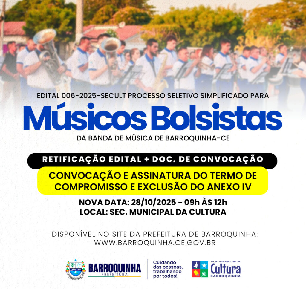 A Secretaria Municipal da Cultura, no uso de suas atribuições legais, torna público a retificação ao EDITAL Nº 006-2025-SECULT – PROCESSO SELETIVO SIMPLIFICADO PARA MÚSICOS BOLSISTAS DA BANDA DE MÚSICA DE BARROQUINHA-CE, onde ALTERA a data e horário da CONVOCAÇÃO E ASSINATURA DO TERMO DE COMPROMISSO, descrito no ANEXO I do edital, além de EXCLUIR o ANEXO IV, conforme se demonstra em documento anexado.